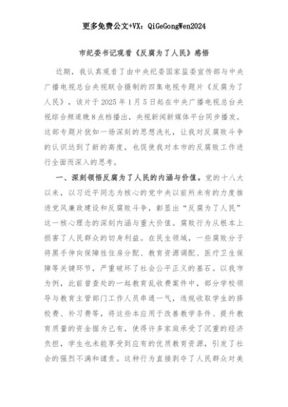 【七哥公文】2025年:市纪委书记观看《反腐为了人民》感悟+更多免费公文+VX:QiGeGongWen2024+更多免费公文+VX:QiGeGongWen2024