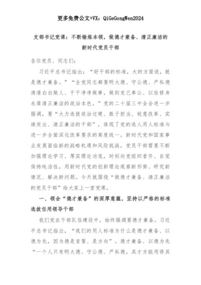 【七哥公文】2025年:支部书记党课:不断锤炼本领,做德才兼备、清正廉洁的新时代党员干部+更多免费公文+VX:QiGeGongWen2024+更多免费公文+VX:QiGeGongWen2024