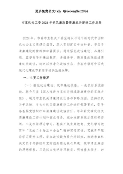 【七哥公文】2025年:市直机关工委2024年党风廉政暨清廉机关建设工作总结+更多免费公文+VX:QiGeGongWen2024+更多免费公文+VX:QiGeGongWen2024