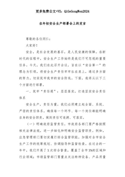 【七哥公文】2025年:在年初安全生产部署会上的发言+更多免费公文+VX:QiGeGongWen2024+更多免费公文+VX:QiGeGongWen2024