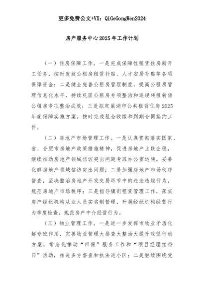 【七哥公文】2025年:房产服务中心2025年工作计划+更多免费公文+VX:QiGeGongWen2024+更多免费公文+VX:QiGeGongWen2024