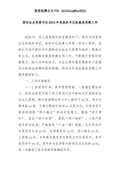 【七哥公文】2025年:国有企业党委书记2024年党组织书记抓基层党建工作+更多免费公文+VX:QiGeGongWen2024+更多免费公文+VX:QiGeGongWen2024