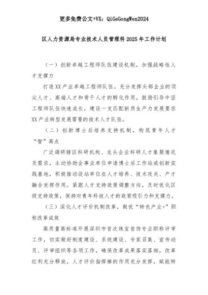 【七哥公文】2025年:区人力资源局专业技术人员管理科2025年工作计划+更多免费公文+VX:QiGeGongWen2024+更多免费公文+VX:QiGeGongWen2024