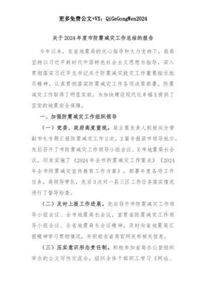 【七哥公文】2025年:关于2024年度市防震减灾工作总结的报告+更多免费公文+VX:QiGeGongWen2024+更多免费公文+VX:QiGeGongWen2024