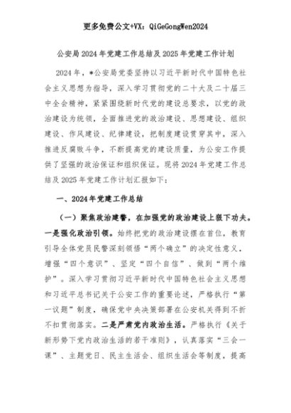【七哥公文】2025年:公安局2024年党建工作总结及2025年党建工作计划+更多免费公文+VX:QiGeGongWen2024+更多免费公文+VX:QiGeGongWen2024
