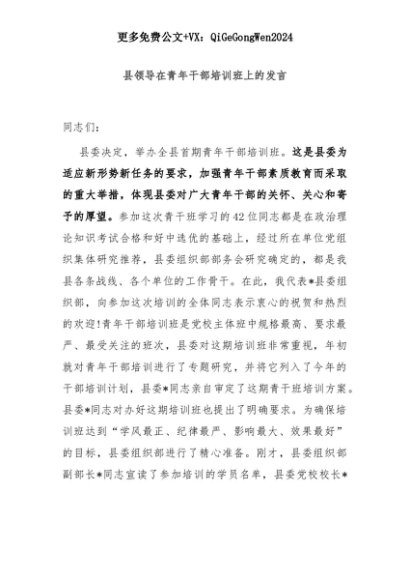 【七哥公文】2025年:县领导在青年干部培训班上的发言+更多免费公文+VX:QiGeGongWen2024+更多免费公文+VX:QiGeGongWen2024