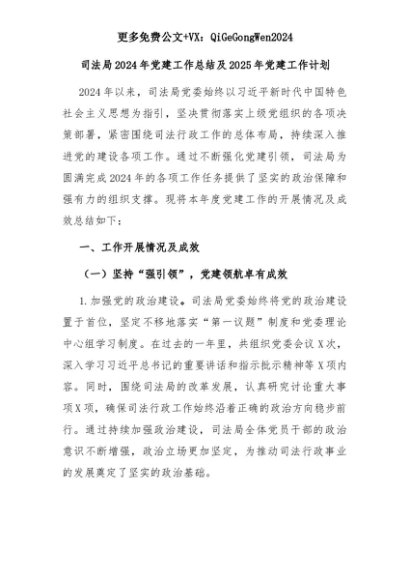 【七哥公文】2025年:司法局2024年党建工作总结及2025年党建工作计划+更多免费公文+VX:QiGeGongWen2024+更多免费公文+VX:QiGeGongWen2024