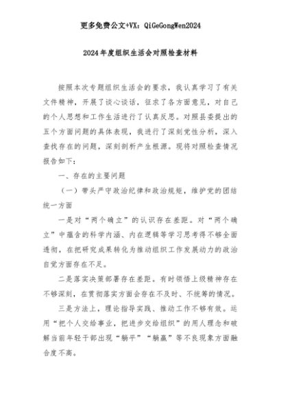 【七哥公文】2025年:2024年度组织生活会对照检查材料+更多免费公文+VX:QiGeGongWen2024+更多免费公文+VX:QiGeGongWen2024