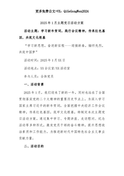 【七哥公文】2025年:2025年1月主题党日活动方案+更多免费公文+VX:QiGeGongWen2024+更多免费公文+VX:QiGeGongWen2024
