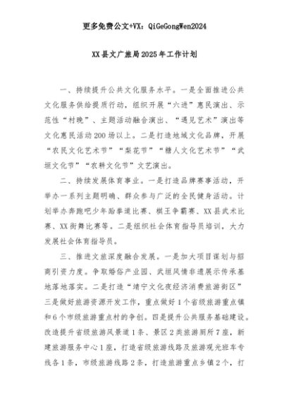 【七哥公文】2025年:XX县文广旅局2025年工作计划+更多免费公文+VX:QiGeGongWen2024+更多免费公文+VX:QiGeGongWen2024