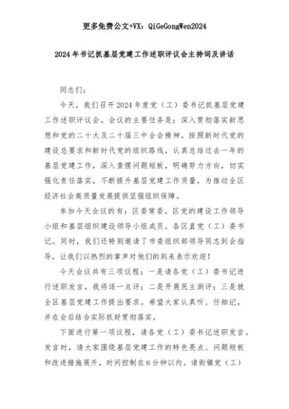 【七哥公文】2025年:2024年书记抓基层党建工作述职评议会主持词及讲话+更多免费公文+VX:QiGeGongWen2024+更多免费公文+VX:QiGeGongWen2024