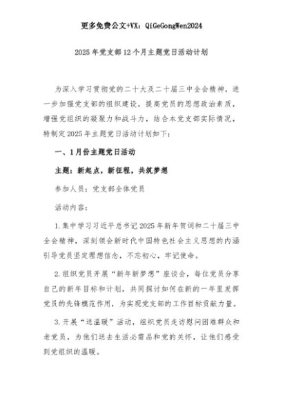 【七哥公文】2025年:2025年党支部12个月主题党日活动计划+更多免费公文+VX:QiGeGongWen2024+更多免费公文+VX:QiGeGongWen2024
