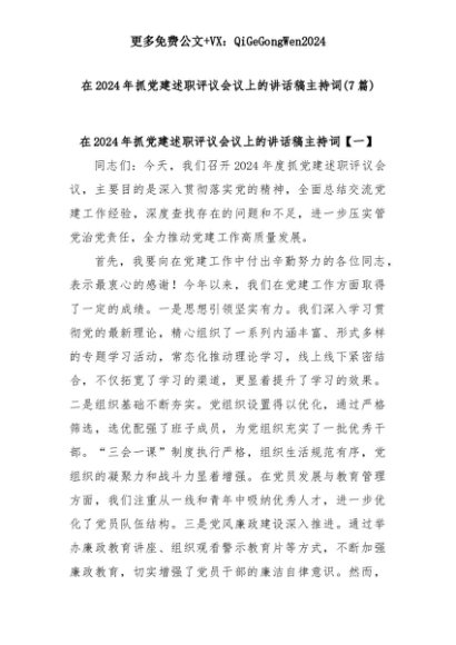 【七哥公文】2025年:(7篇)在2024年抓党建述职评议会议上的讲话稿主持词+更多免费公文+VX:QiGeGongWen2024+更多免费公文+VX:QiGeGongWen2024