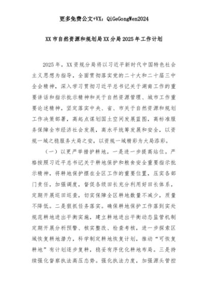 【七哥公文】2025年:XX市自然资源和规划局XX分局2025年工作计划+更多免费公文+VX:QiGeGongWen2024+更多免费公文+VX:QiGeGongWen2024