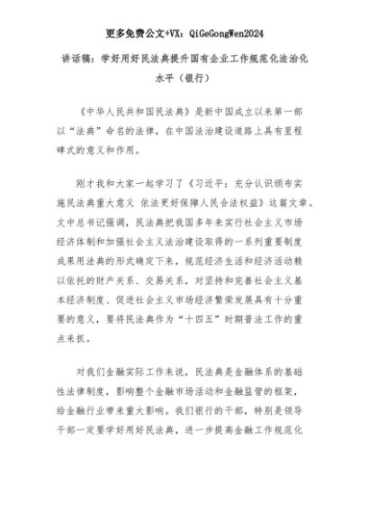 【七哥公文】2025年:讲话稿:学好用好民法典提升国有企业工作规范化法治化水平(银行)+更多免费公文+VX:QiGeGongWen2024+更多免费公文+VX:QiGeGongWen2024