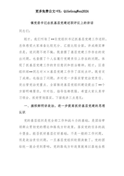 【七哥公文】2025年:镇党委书记在抓基层党建述职评议上的讲话+更多免费公文+VX:QiGeGongWen2024+更多免费公文+VX:QiGeGongWen2024