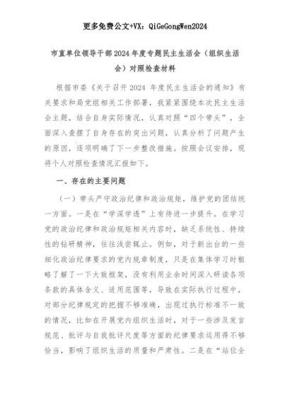 【七哥公文】2025年:市直单位领导干部2024年度专题民主生活会(组织生活会)对照检查材料+更多免费公文+VX:QiGeGongWen2024+更多免费公文+VX:QiGeGongWen2024