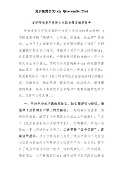 【七哥公文】2025年:某学院党委年度民主生活会落实情况报告+更多免费公文+VX:QiGeGongWen2024+更多免费公文+VX:QiGeGongWen2024