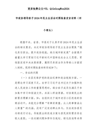 【七哥公文】2025年:市政协领导班子2024年民主生活会对照检查发言材料(四个带头)+更多免费公文+VX:QiGeGongWen2024+更多免费公文+VX:QiGeGongWen2024