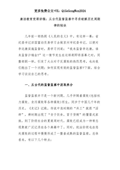 【七哥公文】2025年:廉洁教育党课讲稿:从古代监督监察中寻求破解历史周期律的秘诀+更多免费公文+VX:QiGeGongWen2024+更多免费公文+VX:QiGeGongWen2024