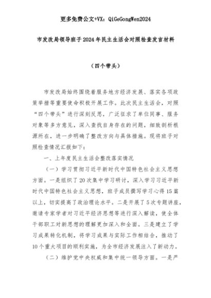 【七哥公文】2025年:市发改局领导班子2024年民主生活会对照检查发言材料(四个带头)+更多免费公文+VX:QiGeGongWen2024+更多免费公文+VX:QiGeGongWen2024