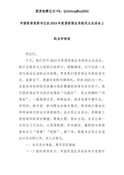 【七哥公文】2025年:市国资委党委书记在2024年度国资国企系统民主生活会上的点评讲话+更多免费公文+VX:QiGeGongWen2024+更多免费公文+VX:QiGeGongWen2024