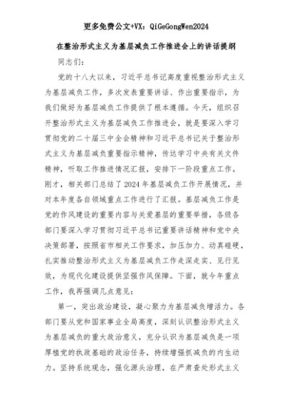 【七哥公文】2025年:在整治形式主义为基层减负工作推进会上的讲话提纲+更多免费公文+VX:QiGeGongWen2024+更多免费公文+VX:QiGeGongWen2024