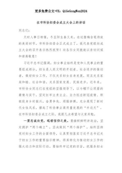 【七哥公文】2025年:在市科协妇委会成立大会上的讲话+更多免费公文+VX:QiGeGongWen2024+更多免费公文+VX:QiGeGongWen2024