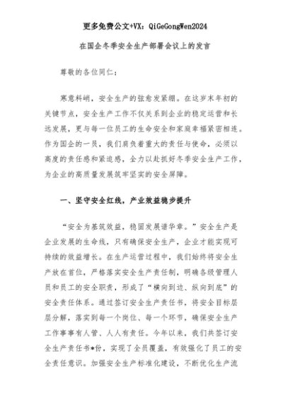 【七哥公文】2025年:在国企冬季安全生产部署会议上的发言+更多免费公文+VX:QiGeGongWen2024+更多免费公文+VX:QiGeGongWen2024