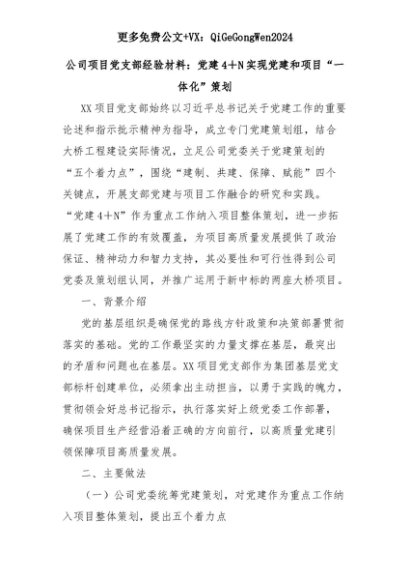 【七哥公文】2025年:公司项目党支部经验材料:党建4+N实现党建和项目“一体化”策划+更多免费公文+VX:QiGeGongWen2024+更多免费公文+VX:QiGeGongWen2024