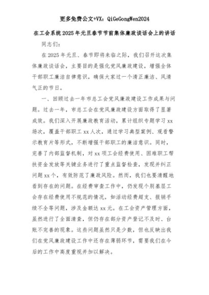 【七哥公文】2025年:在工会系统2025年元旦春节节前集体廉政谈话会上的讲话+更多免费公文+VX:QiGeGongWen2024+更多免费公文+VX:QiGeGongWen2024