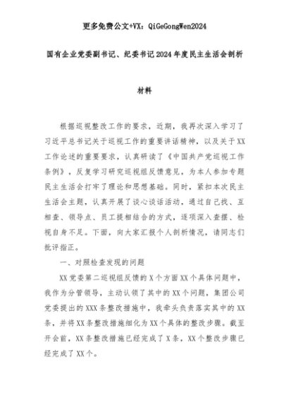 【七哥公文】2025年:国有企业党委副书记、纪委书记2024年度民主生活会剖析材料+更多免费公文+VX:QiGeGongWen2024+更多免费公文+VX:QiGeGongWen2024