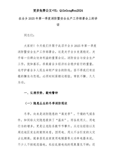 【七哥公文】2025年:在全乡2025年第一季度消防暨安全生产工作部署会上的讲话+更多免费公文+VX:QiGeGongWen2024+更多免费公文+VX:QiGeGongWen2024