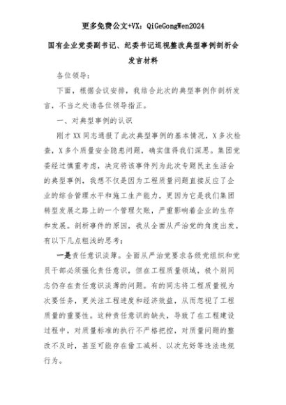 【七哥公文】2025年:国有企业党委副书记、纪委书记巡视整改典型事例剖析会发言材料+更多免费公文+VX:QiGeGongWen2024+更多免费公文+VX:QiGeGongWen2024