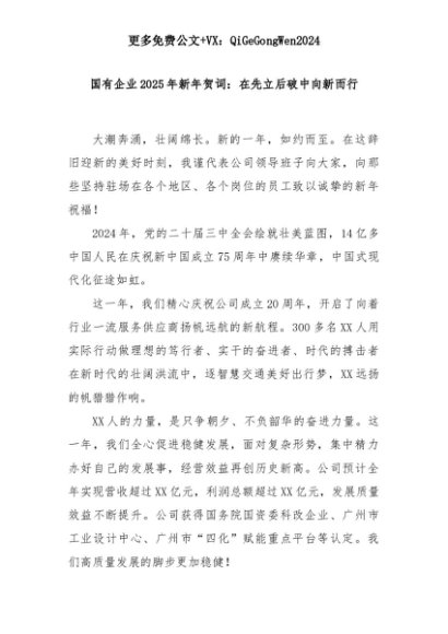 【七哥公文】2025年:国有企业2025年新年贺词:在先立后破中向新而行+更多免费公文+VX:QiGeGongWen2024+更多免费公文+VX:QiGeGongWen2024