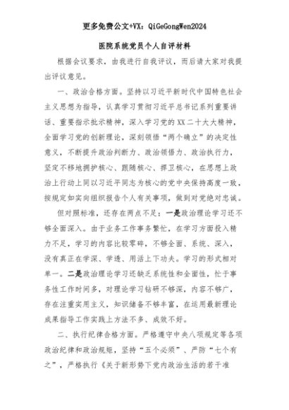 【七哥公文】2025年:医院系统党员个人自评材料+更多免费公文+VX:QiGeGongWen2024+更多免费公文+VX:QiGeGongWen2024
