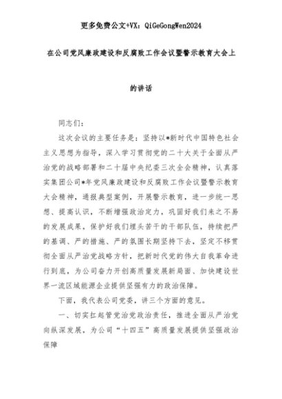 【七哥公文】2025年:在公司党风廉政建设和反腐败工作会议暨警示教育大会上的讲话+更多免费公文+VX:QiGeGongWen2024+更多免费公文+VX:QiGeGongWen2024