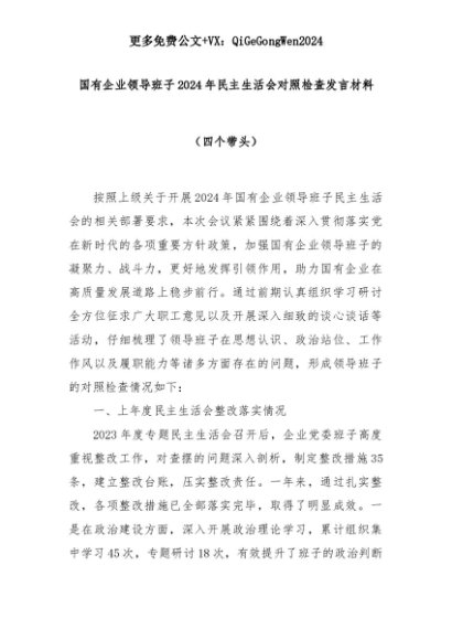 【七哥公文】2025年:国有企业领导班子2024年民主生活会对照检查发言材料(四个带头)+更多免费公文+VX:QiGeGongWen2024+更多免费公文+VX:QiGeGongWen2024