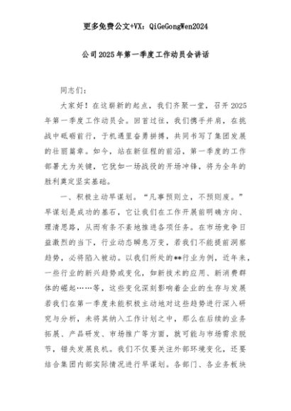 【七哥公文】2025年:公司2025年第一季度工作动员会讲话+更多免费公文+VX:QiGeGongWen2024+更多免费公文+VX:QiGeGongWen2024
