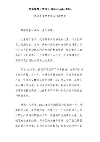 【七哥公文】2025年:企业年会优秀员工代表发言+更多免费公文+VX:QiGeGongWen2024+更多免费公文+VX:QiGeGongWen2024
