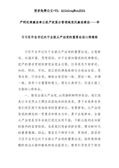 【七哥公文】2025年:严明纪律廉洁奉公抓严抓紧分管领域党风廉政建设——学习总书记关于全面从严治党的重要论述心得感悟+更多免费公文+VX:QiGeGongWen2024+更多免费公文+VX:QiGeGongWen2024