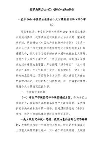 【七哥公文】2025年:一把手2024年度民主生活会个人对照检查材料(四个带头)+更多免费公文+VX:QiGeGongWen2024+更多免费公文+VX:QiGeGongWen2024