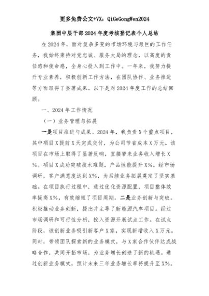 【七哥公文】2025年:集团中层干部2024年度考核登记表个人总结+更多免费公文+VX:QiGeGongWen2024+更多免费公文+VX:QiGeGongWen2024