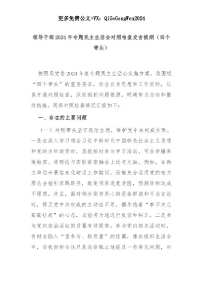 【七哥公文】2025年:领导干部2024年专题民主生活会对照检查发言提纲(四个带头)+更多免费公文+VX:QiGeGongWen2024+更多免费公文+VX:QiGeGongWen2024