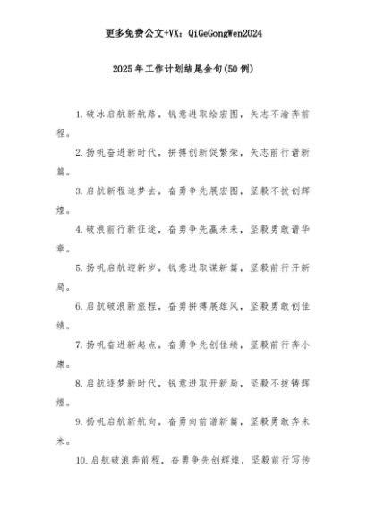 【七哥公文】2025年:(50例)2025年工作计划结尾金句+更多免费公文+VX:QiGeGongWen2024+更多免费公文+VX:QiGeGongWen2024