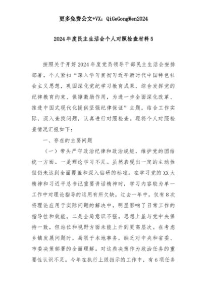 【七哥公文】2025年:2024年度民主生活会个人对照检查材料5+更多免费公文+VX:QiGeGongWen2024+更多免费公文+VX:QiGeGongWen2024