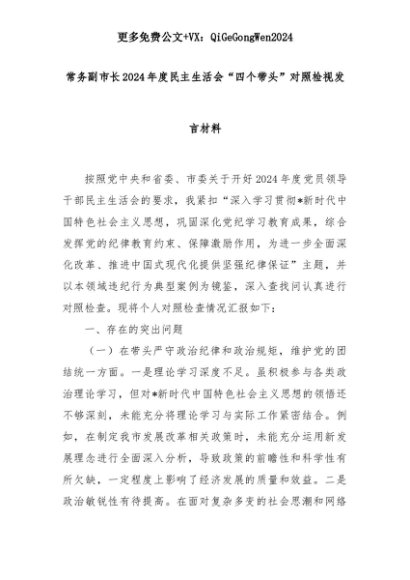 【七哥公文】2025年:常务副市长2024年度民主生活会“四个带头”对照检视发言材料+更多免费公文+VX:QiGeGongWen2024+更多免费公文+VX:QiGeGongWen2024