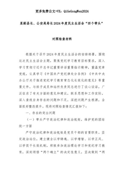 【七哥公文】2025年:某副县长、公安局局长2024年度民主生活会“四个带头”对照检查材料+更多免费公文+VX:QiGeGongWen2024+更多免费公文+VX:QiGeGongWen2024