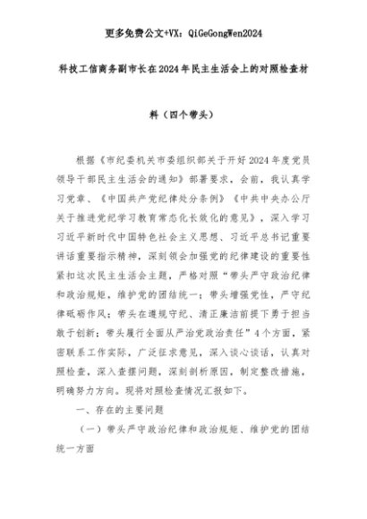 【七哥公文】2025年:科技工信商务副市长在2024年民主生活会上的对照检查材料(四个带头)+更多免费公文+VX:QiGeGongWen2024+更多免费公文+VX:QiGeGongWen2024