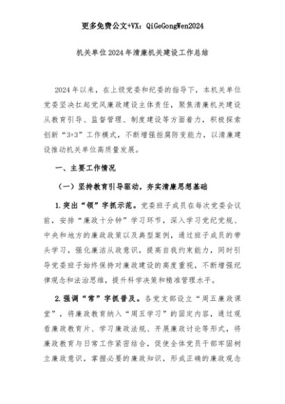 【七哥公文】2025年:机关单位2024年清廉机关建设工作总结+更多免费公文+VX:QiGeGongWen2024+更多免费公文+VX:QiGeGongWen2024